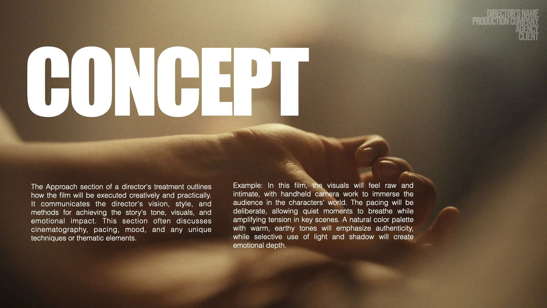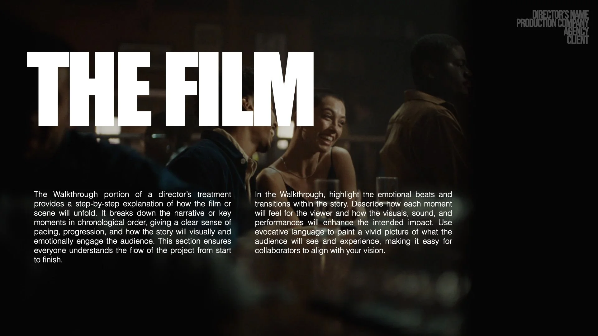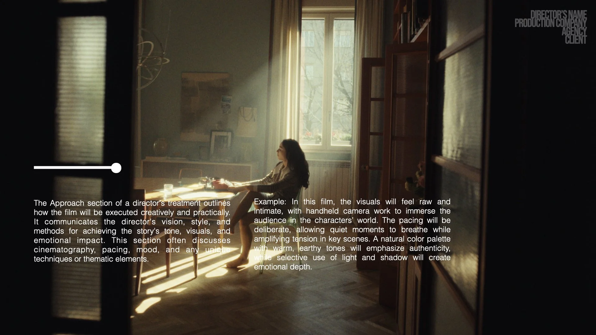 Introducing Paradiso, a sleek and immersive Keynote treatment template designed for storytellers who want to captivate their audience with striking visuals and effortless flow. Built for directors, agencies, and creatives, Paradiso balances bold typography with clean layouts, allowing your ideas to take center stage. Whether you're pitching a commercial, a feature film, or a brand campaign, this template keeps your vision clear, compelling, and unforgettable.