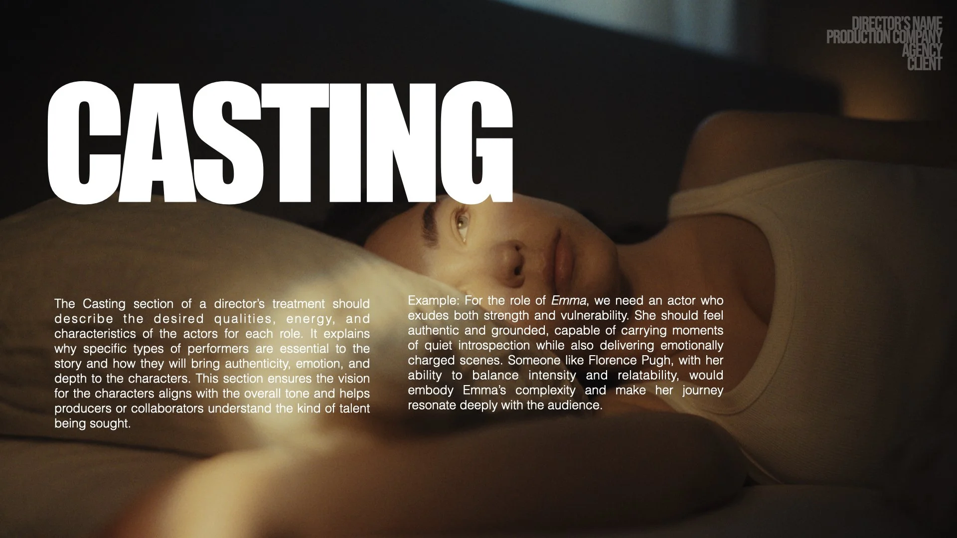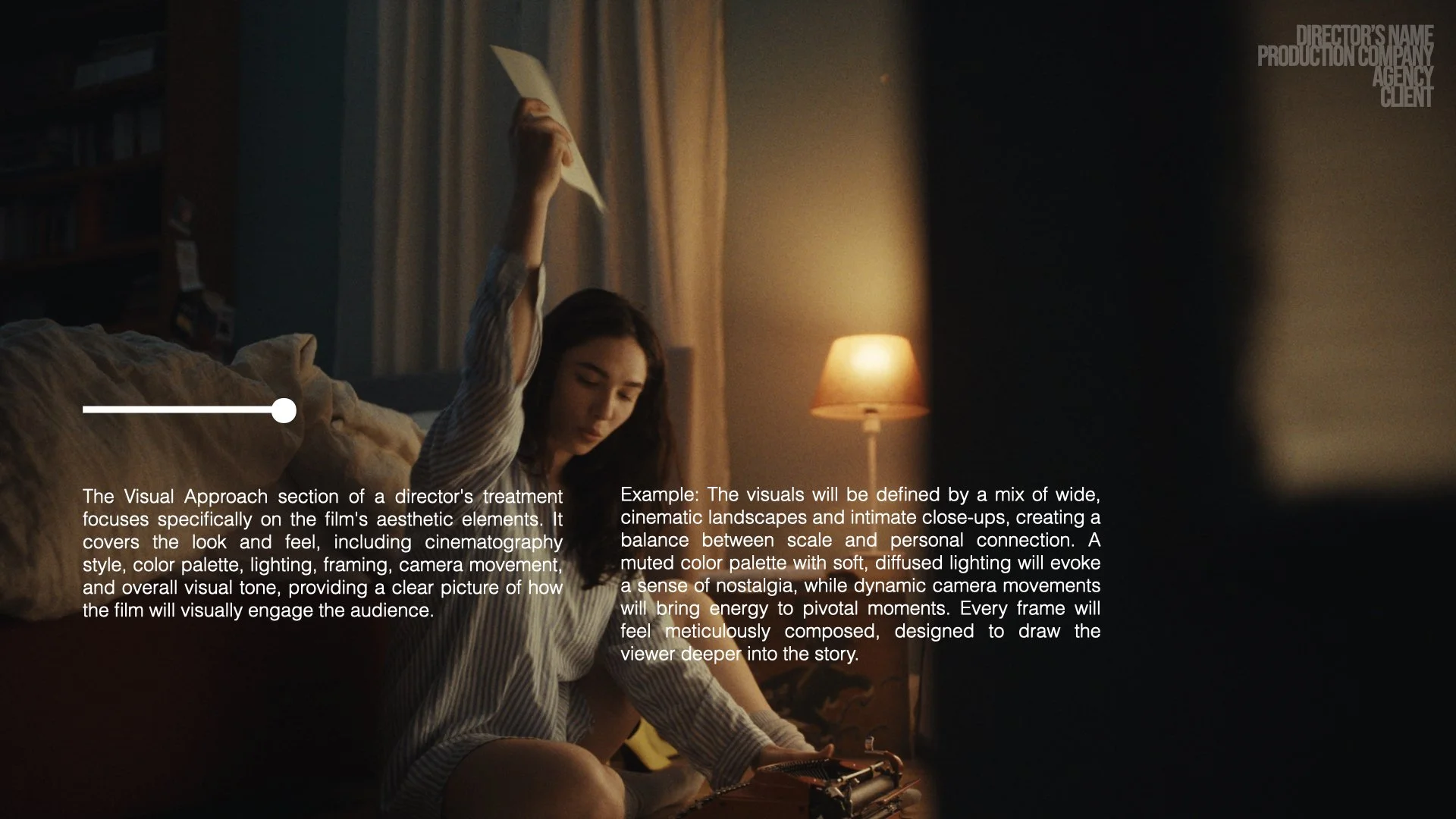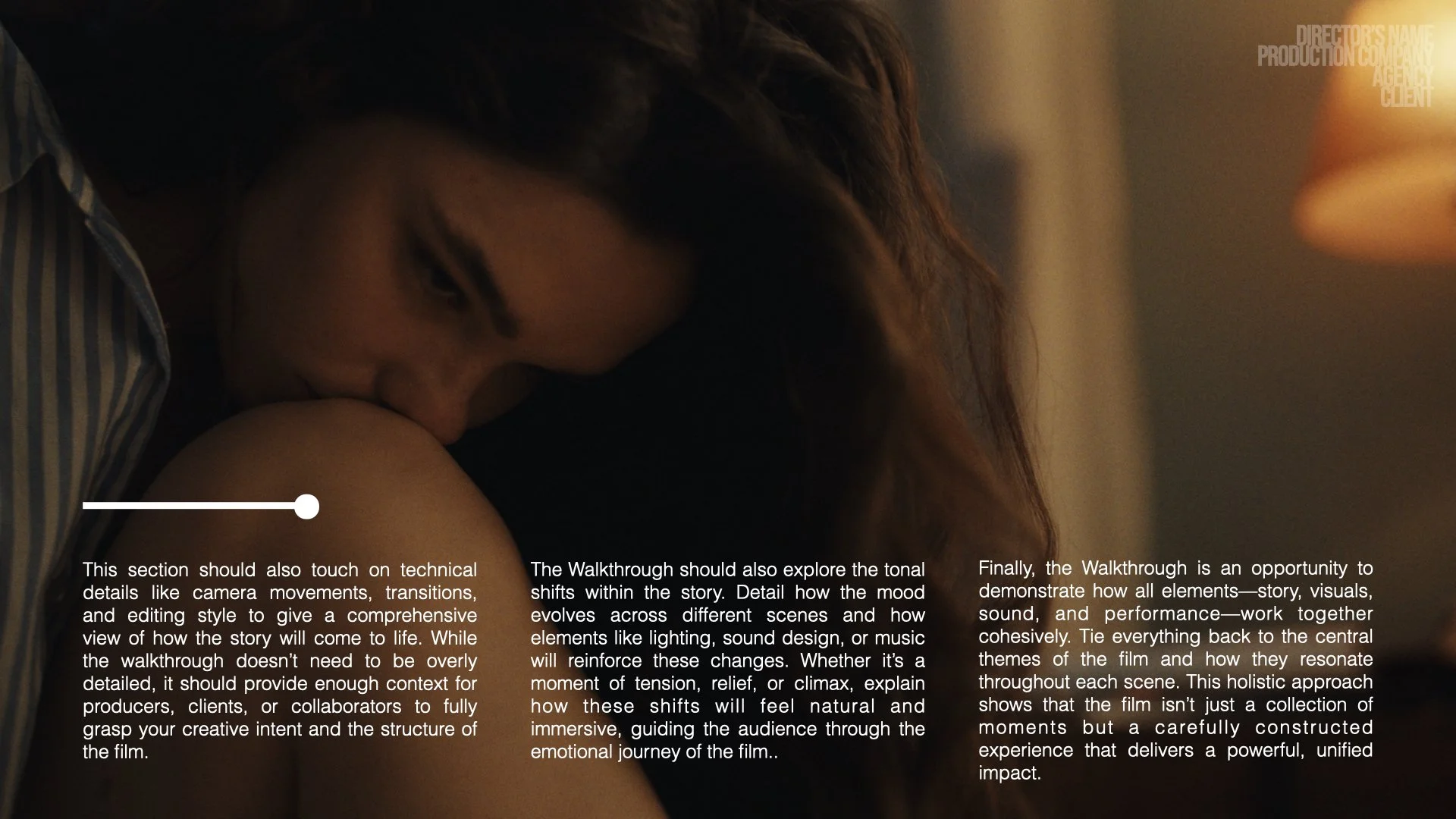 Introducing Paradiso, a sleek and immersive Keynote treatment template designed for storytellers who want to captivate their audience with striking visuals and effortless flow. Built for directors, agencies, and creatives, Paradiso balances bold typography with clean layouts, allowing your ideas to take center stage. Whether you're pitching a commercial, a feature film, or a brand campaign, this template keeps your vision clear, compelling, and unforgettable.